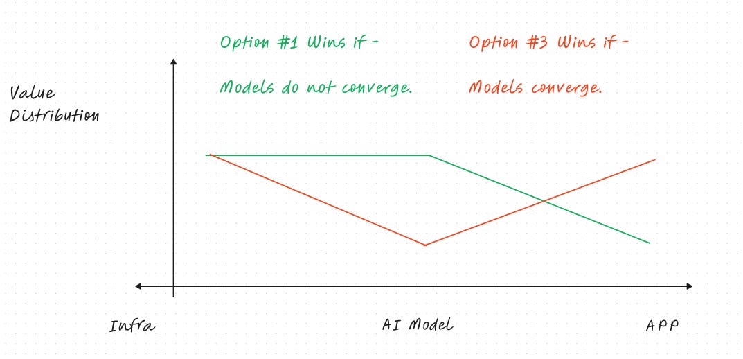 Conversely, if the models do not converge, the primary differentiation in the end product is the AI itself, and it is likely that option #1 (i.e., end-to-end model-application integration) will win out.
