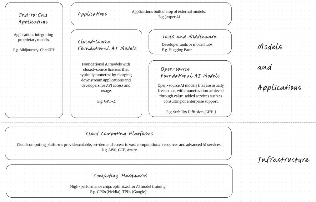 Unlike the infrastructure layer, the model-to-application layers experience both vertical and horizontal competition, with no consensus yet on how business models will be organized.