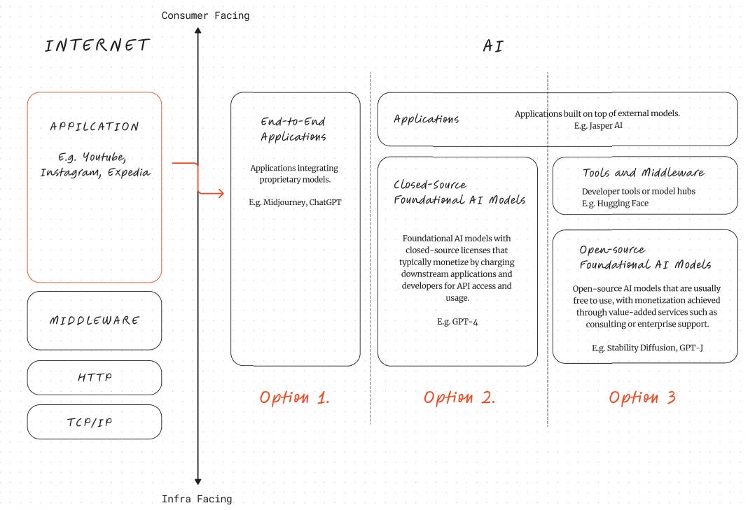 The initial popular view was that, similar to the internet era, options 2 and 3 would be the dominant business models in the AI era.